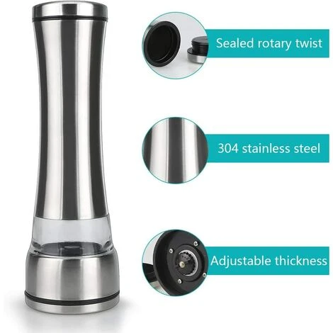 L’ensemble de moulins à sel et à poivre en acier inoxydable est un ensemble de moulin facile à utiliser d’une seule main. Mouture réglable de fine à grossière pour un assaisonnement supérieur. Le mécanisme universel en céramique permet de moudre le sel et le poivre, ajoutant une touche de commodité à chaque repas à la maison. Fonctionnalités: Matériau en acier inoxydable et en verre non toxique et sain Chocs résistants et durables Grossièreté réglable pour toutes les épices Garder des épices fraîches Conception de forme exquise, facile à saisir Broyage en douceur, facile à utiliser Recharge facile de nouvelles épices Corps en acrylique transparent pratique pour connaître la quantité d’épices et le temps de recharge Caractéristiques: Matériau: acier inoxydable / verre Taille: 8,26 x 2 x 2,5 pouces Poids: 0,45 lb Le forfait comprend: 2 x moulins à sel et à poivre